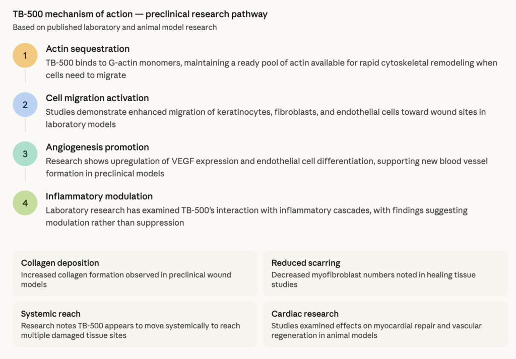 All information in this post is drawn from published peer-reviewed scientific literature and is provided for educational purposes only. TB-500 available through Valen Research is classified strictly as Research Use Only (RUO). It is not intended for human or animal consumption, is not FDA-approved, and is not intended to diagnose, treat, cure, or prevent any disease or medical condition. Researchers should consult applicable institutional and regulatory requirements before working with any research compounds.