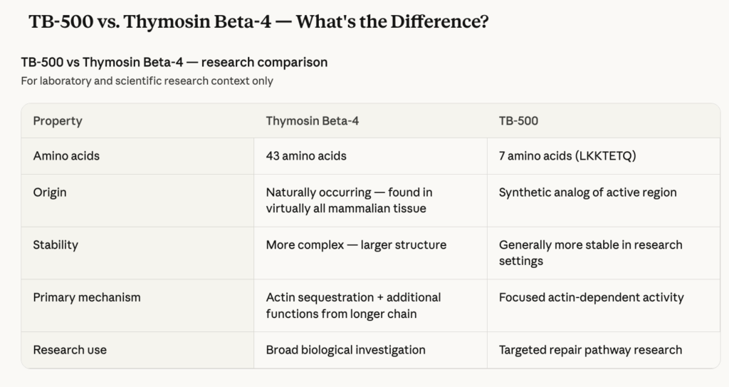 Thymosin Beta-4 itself is a 43 amino acid peptide. Through systematic research, scientists identified that the first seven amino acids — the sequence LKKTETQ — retained significant biological activity comparable to the parent molecule. A landmark 2003 study demonstrated that this truncated sequence, now known as TB-500, could promote wound healing at rates similar to the full Thymosin Beta-4 molecule. parahealth