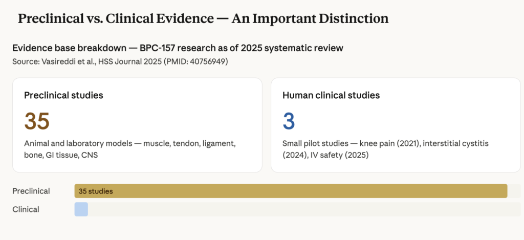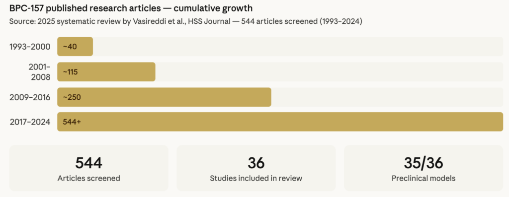 A 2025 systematic review identified 544 articles on BPC-157 published between 1993 and 2024. Of the 36 studies that met inclusion criteria, 35 were preclinical and only one was a clinical study — a ratio that reflects the current state of the research and the significant gap between laboratory findings and human clinical evidence.